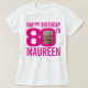 Happy 80th Birthday pink text, custom photo, and name t-shirt. Fun 80th personalised photo hot pink and white birthday tee design. Personalise this birthday shirt with a photograph of the birthday girl in the middle of the number 0. Great idea for adding some fun to a milestone eightieth birthday party or event. Other matching items and colours are available. Exclusive design by Sarah Trett for www.mylittleeden.com