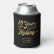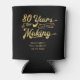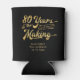 Retro 80th birthday personalised can coolers featuring a retro gold calligraphy script typography title 80 YEARS IN THE MAKING which incorporates his or her birth year within the design and your custom text in your choice of background colour (shown in black). ASSISTANCE: For help with design modification or personalisation, colour change, resizing, transferring the design to another product or if you would like coordinating items, contact the designer BEFORE ORDERING via the Zazzle Chat MESSAGE tab below or email makeitaboutyoustore@gmail.com.