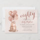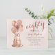 This beautiful 80th birthday party invitation featuring a 2-layer rose gold glitter cake with rose gold balloons, the number 80 in rose gold on blush would be perfect for celebrating your wife, sister, friend, mum, aunt, grandmother. It is traditional and classic while being fresh, modern and contemporary. The back is a lovely coordinating soft rose gold foil.