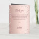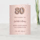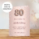 A faux rose gold gradient background with pink diamonds. The name is written with a modern dark rose gold coloured hand lettered style script. Number 80 is written with a balloon style font, script. Welcome text, photo, menu and a thank you note on the back.