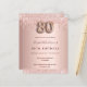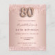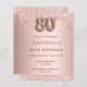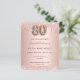 A modern, stylish and glamourous invitation for a 80th birthday party. A rose gold background with drips. The name is written with a modern dark rose gold coloured hand lettered style script. Personalise and add your party details. Number 80 is written with a balloon style font, script.