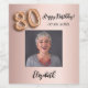 A rose gold, blush pink background decorated. Personalise and add a date, name and a photo. Age number written with a balloon style font.