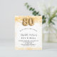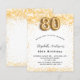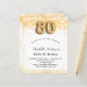 For an elegant 80th birthday party. A chic white background. Decorated with faux gold glitter, sparkles. Personalise and add a name, age and party details. The name is written with a hand lettered style script. Number 80 with balloon style font.