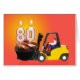 An 80th birthday card showing a forklift carrying a giant cupcake with burning candles on top.