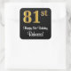 This stylish, sophisticated, and elegant birthday square sticker design features a large ordinal number “81st” having an imitation/faux gold-inspired appearance, plus the birthday greeting message “Happy 81st Birthday,” and an editable name in a script-style font. The background is coloured black. Elegant stickers like this could be used when wrapping a birthday present or gift being given to somebody who is celebrating their eighty first birthday, or perhaps may be given out to the attendees at a birthday party. [~Z0000517]
