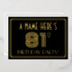 The front of this vintage-appearance eighty-first birthday party/celebration foil invitation features a customisable name, a large art deco look inspired number “81ST”, the message “BIRTHDAY PARTY!”, and a border pattern consisting of lines. The background of the front is coloured black by default, but it can be customised to a different colour if desired. The back features personalised details about the event, such as the date, time, location, and any other relevant information. Luxurious, elegant, personalised invitations like these might be used to invite guests to a birthday party/celebration being held to honour somebody’s 81st birthday. [~Z0000590]