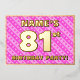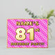 The front of this joyful and fun eighty-first birthday celebration/party foil invitation card design features an editable name, a large number “81st”, the message “BIRTHDAY PARTY!”, and a border. The background of the front has an upbeat dark pink and light pink striped pattern, with heart shapes. The back features personalised details about the event, such as the date, time, place, and any other information that may be important. Customisable invitations like these might be a fun way to invite attendees to a birthday party being held to celebrate somebody’s 81st birthday. [~Z0000603]