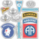 If you’ve been searching for stickers of your army unit insignia and skill badges to proudly display on your vehicle or on anything else, these are for you. Common insignia and badges worn in the 1980s. Includes unit insignia, Ranger tab, Master, Senior and Basic jump wings, Combat Jump star, Air Assault wings, Pathfinder torch, CIB, EIB, CMB, EMB, Jungle Expert and 18th ABN Recondo badge.
