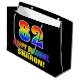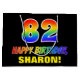 This colourful, fun, and cheerful birthday gift bag design features a large number "82" and the message "HAPPY BIRTHDAY,", both coloured with a rainbow spectrum gradient inspired pattern, along with a bold yellow editable recipient name. The background is coloured black. A fun birthday themed gift bag like this might be used when giving a gift or present in celebration of somebody’s 82nd birthday. [~Z0000477]