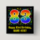 This fun, colourful, and vibrant birthday themed button design features a large number "83" with a rainbow spectrum gradient inspired pattern, along with the message "Happy 83rd Birthday,", and a personalised name. Part of the background has a colourful music notes and symbols pattern. Fun, editable birthday themed buttons like this might be worn by the attendees at a birthday party being held to honour a song composer’s, a singer’s, a musician’s, or somebody else’s eighty third birthday. [~Z0000424]