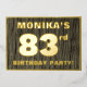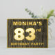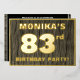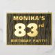 The front of this bold eighty-third birthday party foil invitation card features a customisable name, a large number “83rd”, the message “BIRTHDAY PARTY!”, and a border, all in foil. There is a rustic, yet sophisticated, faux wood grain appearance inspired pattern for the background of the front. The back features personalised details about the event, such as the date, time, place, and any other information that may be important. Customisable invitations like these might be used to invite attendees to a birthday party being held to honour somebody’s 83rd birthday. [~Z0000598]