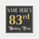 This fancy and elegant birthday themed paper napkin design features a custom name and the message “83rd Birthday Party”. The large number “83rd” has a faux/imitation gold-inspired coloring pattern, the words “Birthday Party” are in opulent script-style text, and the background is colored black by default (although it can be customized). Luxurious, ornate paper napkins like this might be used at a birthday party being held in celebration of somebody’s eighty third birthday. [~Z0000565]