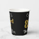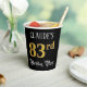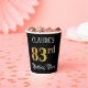 This ornate and elegant birthday themed paper cup design features a personalised name and the message “83rd Birthday Party”. The large number “83rd” has an imitation/faux gold-inspired colouring pattern, the words “Birthday Party” are in opulent script-style text, and the background is coloured black by default (although it can be customised). Fancy, opulent paper cups like this might be used at a birthday celebration/party being held to celebrate somebody’s 83rd birthday. [~Z0000567]