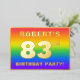 The front of this vibrant and upbeat eighty-third birthday party foil invitation card design features a custom name, a large number “83rd”, the message “BIRTHDAY PARTY!”, and a border. The background of the front has an exciting, colourful, rainbow spectrum inspired gradient pattern. The back features personalised details about the event, such as the date, time, location, and any other useful information. Customisable invitations like these might be a fun way to invite attendees to a birthday gathering/party being held to honour somebody’s 83rd birthday. [~Z0000599]