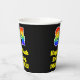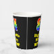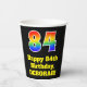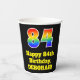 This exciting and fun birthday paper cup design features a large number “84” with a rainbow spectrum gradient inspired pattern, along with the message “Happy 84th Birthday,”, and a customisable name. The background is coloured black. Colourful, vibrant paper cups like this might be fun to have at a birthday party being held in celebration of somebody’s eighty fourth birthday. [~Z0000537]