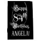 This fancy and opulent birthday giftbag design features the message “Happy 84th Birthday,” in elaborate script style text, on a black coloured background. It also features a custom recipient name. A birthday themed gift bag like this might be a respectable way to wrap a gift or present being given to celebrate somebody’s eighty fourth birthday. [~Z0000557]
