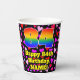 This happy and colourful birthday paper cup design features a large number “84” having a rainbow spectrum gradient inspired pattern. It also features the message “Happy 84th Birthday,”, and a customisable name. The background features a pattern of red, purple, and pink heart shapes. Loving, upbeat paper cups like this might be fun to have at a birthday celebration being held in celebration of somebody’s 84th birthday. [~Z0000548]