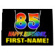 This cheerful, colourful, and fun birthday gift bag design features a large number "85" and the message "HAPPY BIRTHDAY,", both coloured with a rainbow spectrum gradient inspired pattern, along with a bold yellow custom recipient name. The background is coloured black. A fun birthday themed gift bag like this could be used to wrap a gift or present being given to celebrate somebody’s 85th birthday. [~Z0000477]
