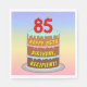 This cheerful and colourful birthday paper napkin design features a cartoon-style depiction of a three-tier birthday cake having number-shaped candles on top showing the age “85“, along with the message “HAPPY 85TH BIRTHDAY,”, and a customisable recipient name. The background features a multi-colour pastel rainbow spectrum inspired gradient pattern. Paper napkins like these might be used at a party held in celebration of somebody’s eighty fifth birthday. [~Z0000623]