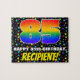 This eye-catching and vibrant birthday themed jigsaw puzzle design features a large number “85” having a multicolored rainbow spectrum inspired gradient pattern. It also features the message “HAPPY 85th BIRTHDAY,”, and a personalised recipient name. The background features a bold, colourful star shapes pattern. An exciting, customised birthday puzzle like this might be used to acknowledge somebody’s eighty-fifth birthday. [~Z0000607]