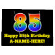 This vibrant and fun birthday themed gift bag design features a large number "85" with a rainbow spectrum gradient inspired pattern, along with the message "Happy 85th Birthday,", and a custom name. The background is coloured black. A colourful birthday themed giftbag like this might be used when giving a gift or present in celebration of somebody’s eighty fifth birthday. [~Z0000521]