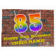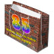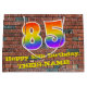 This vibrant and colourful birthday themed giftbag design, inspired by graffiti and urban art, features a large number "85" having a rainbow spectrum gradient inspired pattern. It also features the message "Happy 85th Birthday,", and an editable name. The background features a brick wall style pattern. A gift bag like this might be used when wrapping gifts being given to somebody in celebration of their 85th birthday. [~Z0000522]