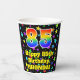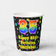 This cheerful and colourful birthday-themed paper cup design features a large number “85” having a rainbow spectrum gradient inspired pattern. It also features the message “Happy 85th Birthday,”, and an editable name. The background features an exciting and colourful star field inspired pattern. Colourful, vibrant paper cups like this might be fun to use at a birthday celebration/party being held in celebration of somebody’s eighty fifth birthday. [~Z0000540]