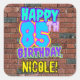 This fun birthday square sticker design features the message “HAPPY 85TH BIRTHDAY,” having a colourful, vibrant, urban street art and graffiti inspired look, plus a customisable recipient name. The background features a pattern inspired by the look of a brick wall. Vibrant, fun, personalised stickers like this might be given as a birthday present, or used while wrapping presents/gifts, or perhaps used as birthday party decorations when celebrating somebody’s 85th birthday. [~Z0000535]