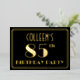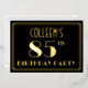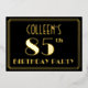 The front of this Roaring Twenties inspired eighty-fifth birthday party/celebration foil invitation features a customisable name, a large art deco style inspired number “85th”, the message “BIRTHDAY PARTY”, and a border pattern consisting of lines. The front also has a black-coloured background by default, but it can be customised to a different colour if desired. The back features personalised details about the event, such as the date, time, venue, and any other information that may be important. Luxurious, elegant, customised invitations like these might be used to invite guests to a birthday gathering/party being held to celebrate somebody’s 85th birthday. [~Z0000591]