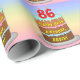 This cheerful and upbeat birthday-themed wrapping paper design features a cartoon-style depiction of a three-tier birthday cake having number-shaped candles on top showing the age “86“, along with the message “HAPPY 86TH BIRTHDAY,”, and an editable recipient name. The background features a multi-colour pastel rainbow spectrum inspired gradient pattern. Wrapping paper like this might be used when wrapping gifts being given to somebody in celebration of their eighty sixth birthday. [~Z0000622]