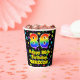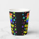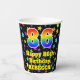This fun and exciting birthday-themed paper cup design features a large number “86” having a rainbow spectrum gradient inspired pattern. It also features the message “Happy 86th Birthday,”, and a personalised name. The background features an exciting and colourful star field inspired pattern. Vibrant, colourful paper cups like this might be fun to use at a birthday celebration being held in celebration of somebody’s eighty sixth birthday. [~Z0000540]