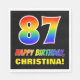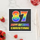 This cheerful, fun, and colourful birthday paper napkin design features a large number "87" and the message "HAPPY BIRTHDAY,", both having a rainbow spectrum gradient inspired pattern colouring, along with a bold yellow custom recipient name. The background is coloured black. Birthday themed paper napkins like this might be fun to use at a party being held to celebrate somebody’s eighty seventh birthday. [~Z0000476]