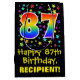 This exciting, colourful, and vibrant birthday gift bag design features a large number "87" with a rainbow spectrum gradient inspired pattern, along with the message "Happy 87th Birthday,", and a personalised recipient name. It also has a colourful background pattern featuring variously-sized star shapes. A giftbag like this might be used when giving a gift or present in honour of somebody’s eighty seventh birthday. [~Z0000510]