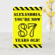 The front of this bold and attention-grabbing birthday themed greeting card design features a custom name and the message "YOU’RE NOW 87 YEARS OLD!" in black stencil look text on a yellow colored background. There is also an eye-catching yellow and black stripes pattern at the top and bottom edges of the front. The inside features a custom birthday greeting message, or could perhaps be cleared and left blank if a message is to be written by hand instead. A customizable birthday card like this might be a fun way to acknowledge somebody’s eighty seventh birthday. [~Z0000413]