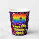This fun and cheerful birthday paper cup design features a large number “87” with a rainbow spectrum gradient inspired pattern, along with the message “Happy 87th Birthday,”, and a personalised name. The background features a pattern of purple, red, and pink heart shapes of various sizes. Loving, cheerful paper cups like this might be fun to have at a birthday party/celebration being held to celebrate somebody’s 87th birthday. [~Z0000548]