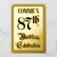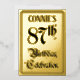 The front of this ornate and elegant eighty-seventh birthday celebration/party foil announcement card design features the message “87th Birthday Celebration” in fancy script-style text. It also features an editable name. The back features personalised details about the event, such as the date, time, venue/location, and any other information that may be relevant. Elaborate, luxurious, customisable invitations like these might be used to invite guests to a birthday party being held to celebrate somebody’s 87th birthday. [~Z0000596]