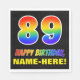 This colourful, fun, and cheerful birthday paper napkin design features a large number "89" and the message "HAPPY BIRTHDAY,", both coloured with a rainbow spectrum gradient inspired pattern, along with a bold yellow personalised recipient name. The background is coloured black. Fun, customisable birthday themed paper napkins like this might be used at somebody’s 89th birthday party. [~Z0000476]