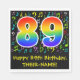 This fun, colourful, and vibrant birthday themed paper napkin design features a large number "89" with a rainbow spectrum gradient inspired pattern, along with the message "Happy 89th Birthday,", and a customisable name. Part of the background has a colourful music notes and symbols pattern. Fun, customised paper napkins like this might be used at a birthday celebration being held in honour of a musician’s, a singer’s, a composer’s, or somebody else’s 89th birthday. [~Z0000421]