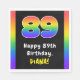 This eye-catching and bold birthday themed paper napkin design features a large number “89“ having a colourful rainbow spectrum inspired gradient pattern, along with the message “Happy 89th Birthday,”, and a personalised recipient name. Fun birthday themed paper napkins like these might be used at a party in celebration of somebody’s 89th birthday. [~Z0000629]
