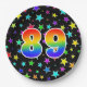 This colourful, fun, and cheerful paper plate design features a large number "89" containing a rainbow spectrum gradient inspired pattern. The background features a pattern of colourful star shapes. Paper plates like this might be used at a party celebrating somebody’s eighty ninth birthday, or a couple’s eighty ninth anniversary, or some other 89th event. [~Z0000493]