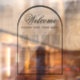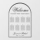 A simple transparent wedding seating chart inside a modern arch frame. The text and the frame are black. The Welcome and the names are written in an elegant calligraphy.