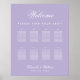 A simple seating chart with 8 tables, for a wedding with lavender wedding colour. The background is lavender (light purple) , the text is white. The word Welcome in the upper part and the names of the bride and groom are written in an elegant calligraphic script, the rest in caps.