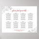 This beautiful wedding seating chart features a chic sophisticated design with dark grey and red text on a white background. The title is an elegant script calligraphy reading: please find your table. The corners are decorated with silver faux foil frills in a delicate floral pattern. Includes seating for 8 tables or 80 guests with 10 seats per table. Wonderful way to help your guests find their tables at your reception while adding a touch of style.