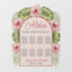 A tropical floral seating chart, appropriate for a Hawaiian wedding / luau. The text is inside a pink arch with burgundy red borders. Around the arch, there are tropical flowers and leaves - monstera and palm leaves and pink hibiscus - painted in watercolor. The title "Aloha" and the names are written in handwriting script, in a burgundy red similar in colour with the centre of the hibiscus flowers, the rest of the text is black (all caps).