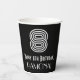 This vintage style and Roaring Twenties inspired birthday themed paper cup design features a large art deco inspired appearance number “8”, along with the birthday greeting message “Happy 8th Birthday,” and a customisable name. It also has a black-coloured background. Birthday themed paper cups like this might be a fun way to celebrate somebody’s eighth birthday. [~Z0000542]