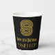 This 1920s/1930s style inspired and vintage style birthday themed paper cup design features a large art deco inspired look number “8”, along with the birthday greeting message “Happy 8th Birthday,” and a personalised name. The background is coloured black. Birthday themed paper cups like this might be used at a party celebrating somebody’s 8th birthday. [~Z0000546]