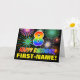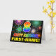 The front of this colourful, cheerful, and fun birthday greeting card design features a large number "8" and the message "HAPPY BIRTHDAY,", both coloured with a rainbow spectrum gradient inspired pattern, along with a bold yellow custom recipient name. The front also has a multicolored background pattern inspired by the look of bursting celebratory fireworks. The inside features an editable birthday greeting message, or could perhaps be cleared and left blank if a message is to be written by hand instead. A cheerful customisable birthday card like this might be a fun way to celebrate somebody’s eighth birthday. [~Z0000471]