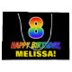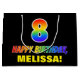 This colourful, fun, and cheerful birthday-themed gift bag design features a large number "8" and the message "HAPPY BIRTHDAY,", both having a rainbow spectrum gradient inspired pattern colouring, along with a bold yellow custom recipient name. The background is coloured black. A fun birthday themed gift bag like this might be used when giving a gift or present in celebration of somebody’s 8th birthday. [~Z0000477]