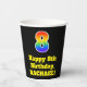 This exciting and colourful birthday paper cup design features a large number “8” having a rainbow spectrum gradient inspired pattern. It also features the message “Happy 8th Birthday,”, and a customisable name. The background is coloured black. Colourful, vibrant paper cups like this might be fun to have at a birthday celebration being held to celebrate somebody’s 8th birthday. [~Z0000537]