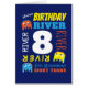 8th birthday name personalised birthday kids block graphic aliens electronic gaming style card. Crazy pixel graphic monster aliens and your own name and age in orange, white, cyan blue, and yellow. Personalise with your child's name currently reads River 8, other name lengths and ages are available if you need assistance please contact me, happy to post one for your name. Matching gift wrap and other items also available. Art and design by www.mylittleeden.com